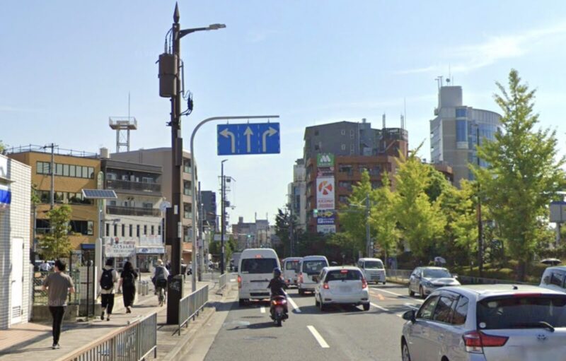 交差点付近でも車線変更禁止のラインは無いですが、無理な車線変更は禁物!手前から標識見えるので見えた時に走行する車線を定めておくことが大切ですね。