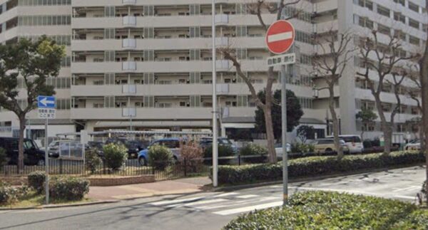 大通りから住宅街の狭い道にやってきました。この標識がある交差点では、直進しかできないことを指しています。これは指定方向外進行禁止の標識です。この交差点は丁字路の交差点なので右折はできません。よく見ると一方通行の標識と、車両進入禁止の標識があります。うっかり見落として逆走しないよう注意しましょう!